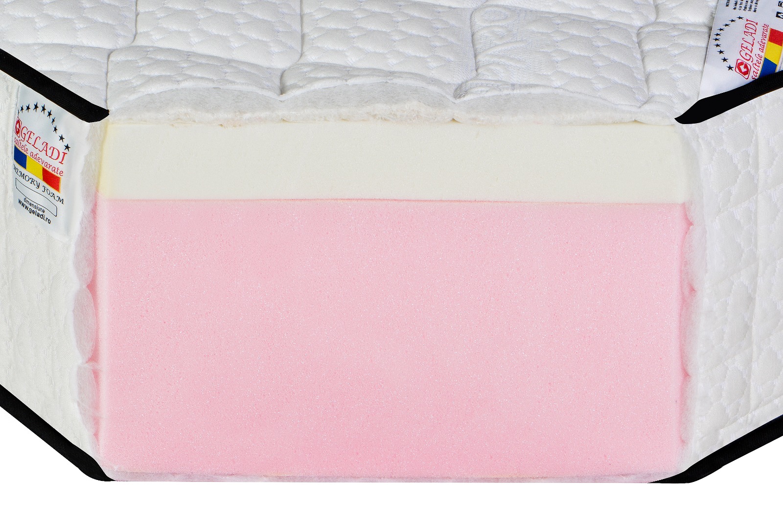 Stratul superior este din spuma Memory foam si are o inaltime de 5 cm. Husa saltelei este formata dintr-o tesatura moale si delicata, matlasata cu vatelina moale si bumbac de 300gr/mp pe zona de dormit.